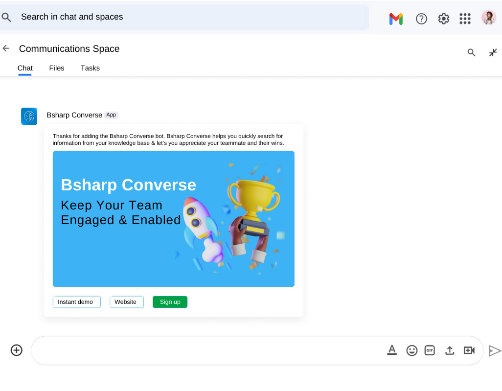 Install the Bsharp Converse bot from the Google Workspace Marketplace in your personal Google Chat, and sign up using the option provided in the card.