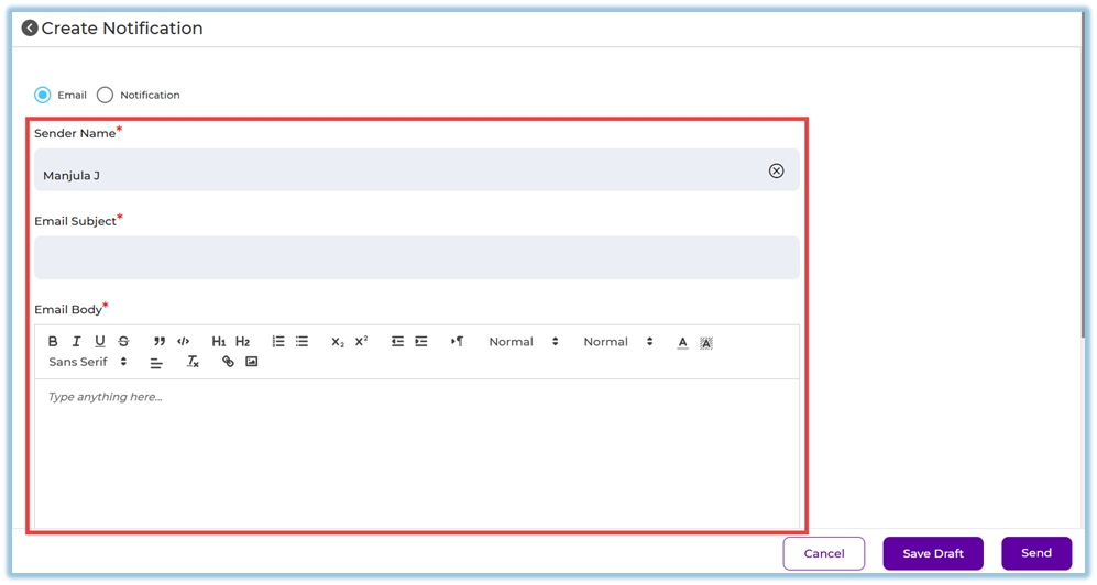 The Communication Centre is a centralized feature in Bsharp Converse that allows admins to send emails and in-app notifications to users. It helps organizations communicate important updates, reminders, and announcements to the right audience at the right time. Messages can be targeted based on modules, forms, or specific users, ensuring relevant and effective communication.