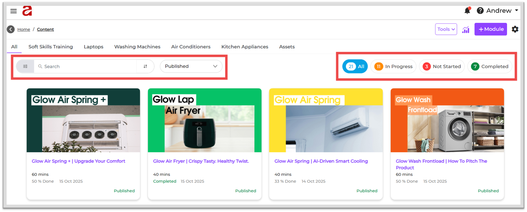 - The All filter shows everything together including Published, In Progress, Not Started, and Completed modules.