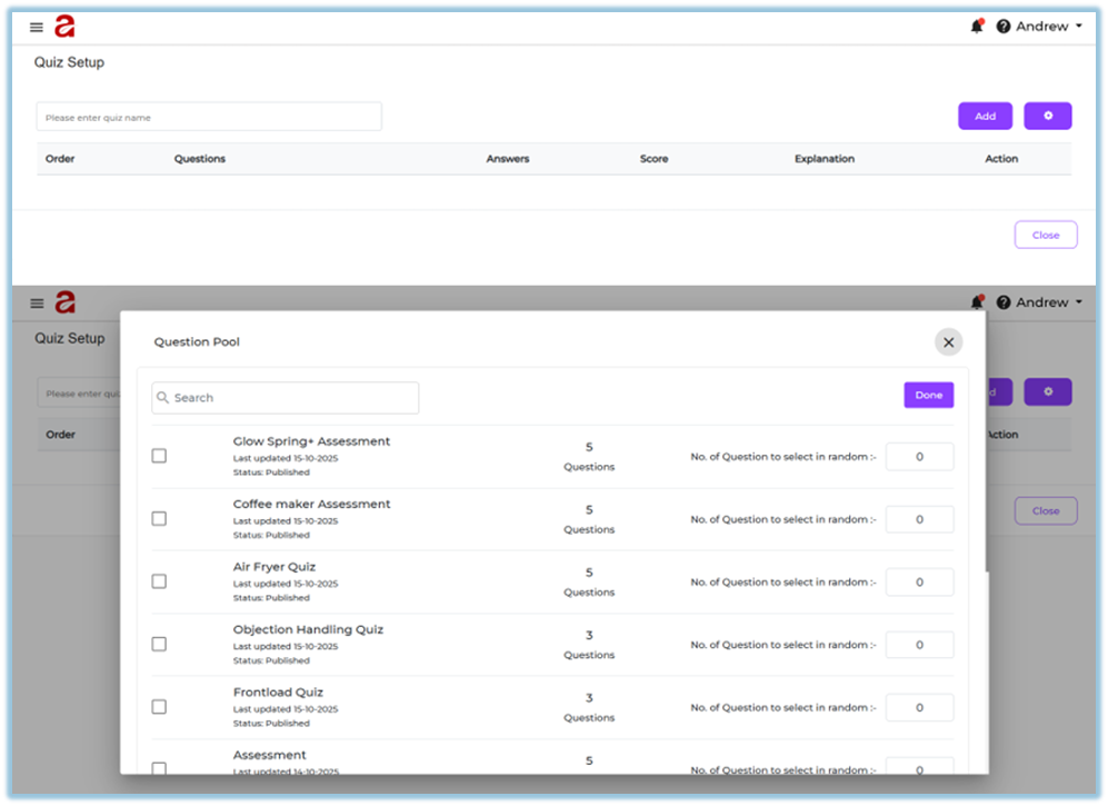Quiz is a content item in Bsharp Converse used to assess learner understanding within a training module. It allows administrators to create structured assessments with different question types, scoring rules, timers, and evaluation settings, and to control how learners attempt and complete assessments.