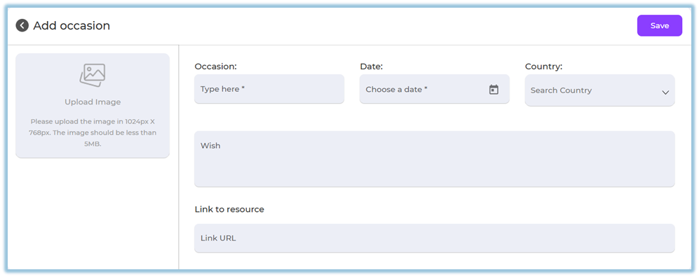 Country-based Occasions: Occasions are enabled based on the selected country.