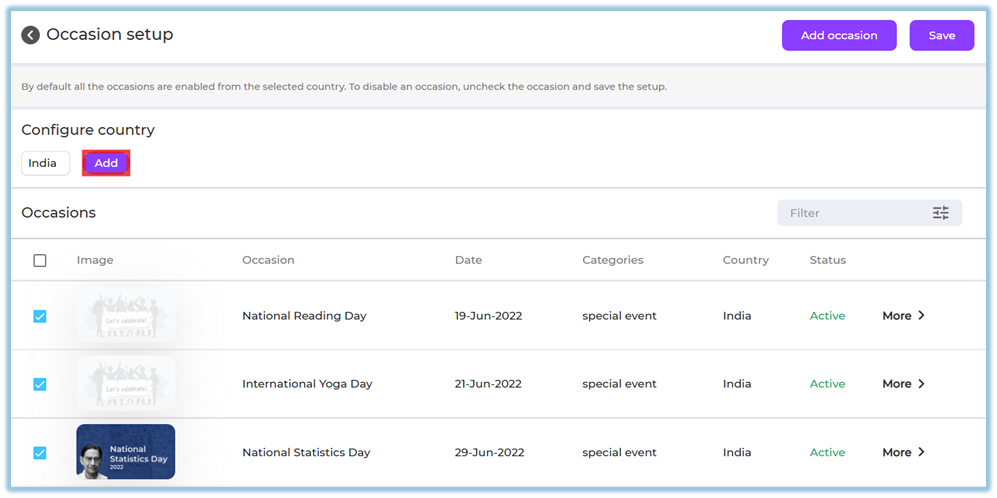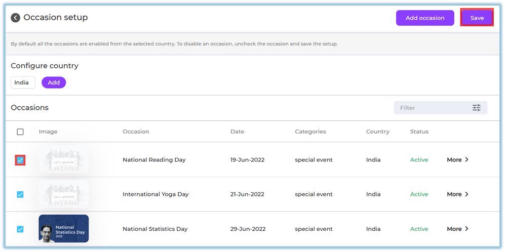 All occasions for the selected country are enabled by default
