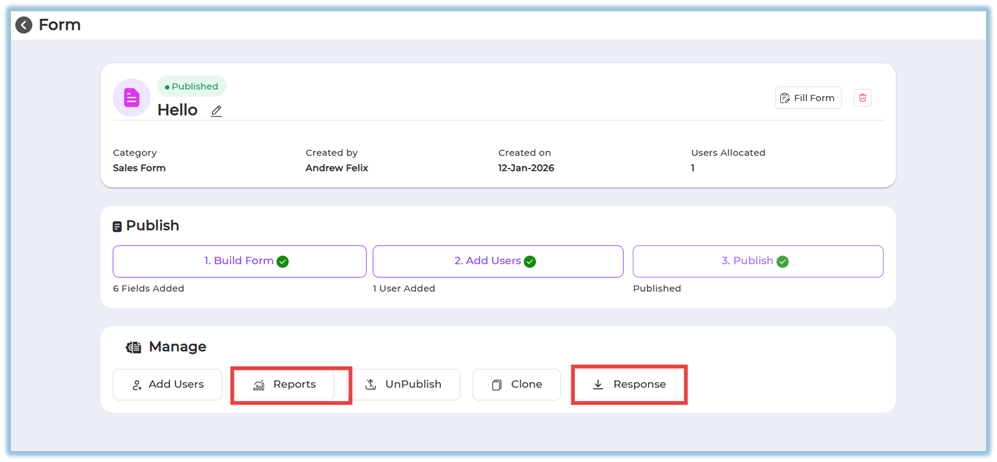 You can add users, unpublish, clone the form, view reports, and download responses.