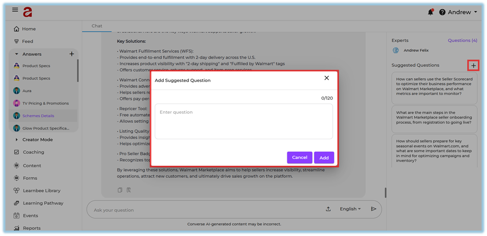 Suggested Questions in Instant Answers help admins add common or important questions in advance. These questions appear in the chat so users know what they can ask in a channel.