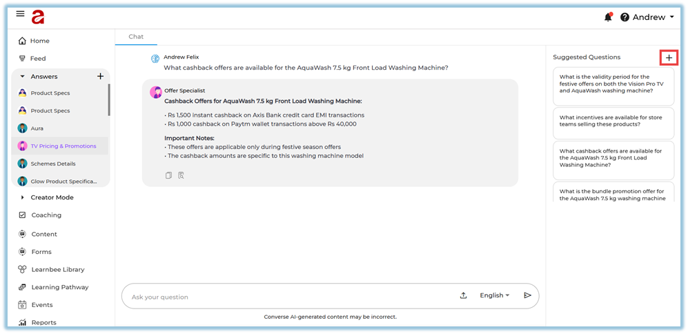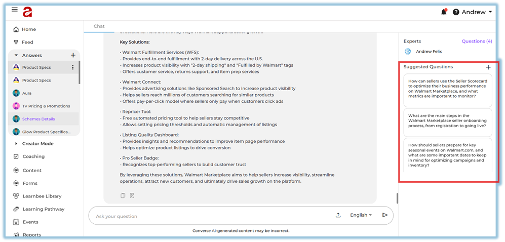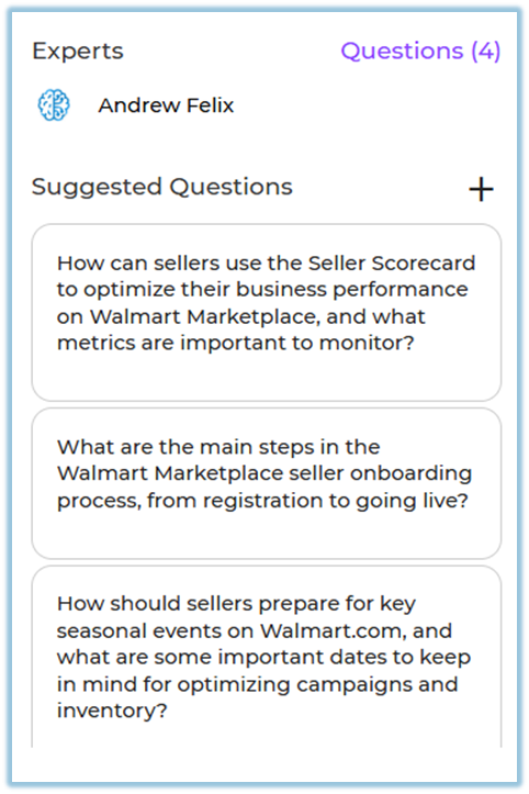 Users see a list of suggested questions in the chat section. They can click on any question to ask it directly, without typing.