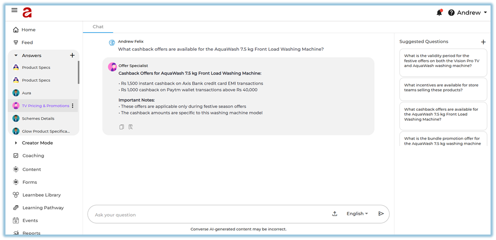 Users can ask questions in a conversational way. Answers are shown instantly and are generated only from the documents uploaded to the system. Users can ask questions in different languages and receive answers in the same language.