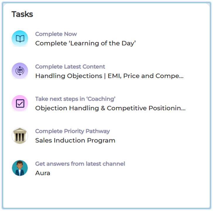 Tasks Widget: A section visible on the Home page that lists pending learning items.