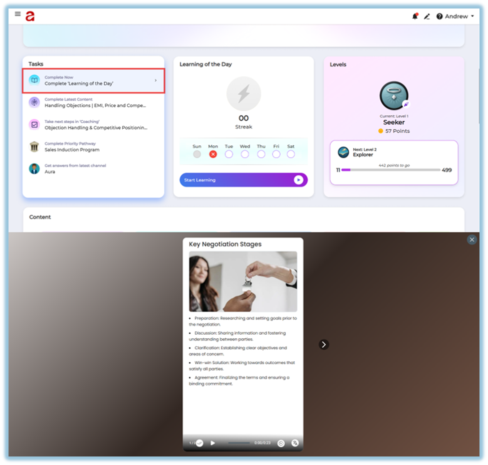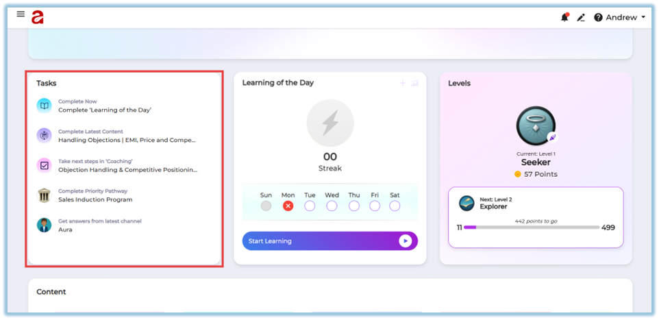 Redirect Action: Clicking a task takes the learner directly to the relevant page.