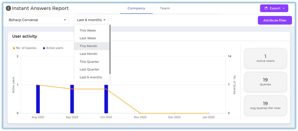The Instant Answers Report provides insights into how users interact with Instant Answers channels across the platform. It helps track user engagement by showing the number of queries raised, active users, and usage trends over a selected period.
