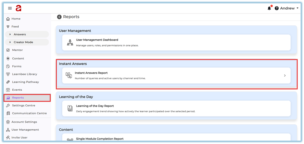 The report is accessed via Reports → Instant Answers Report.