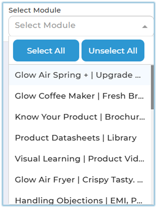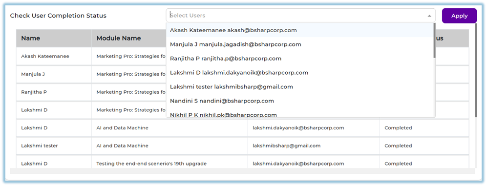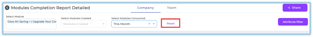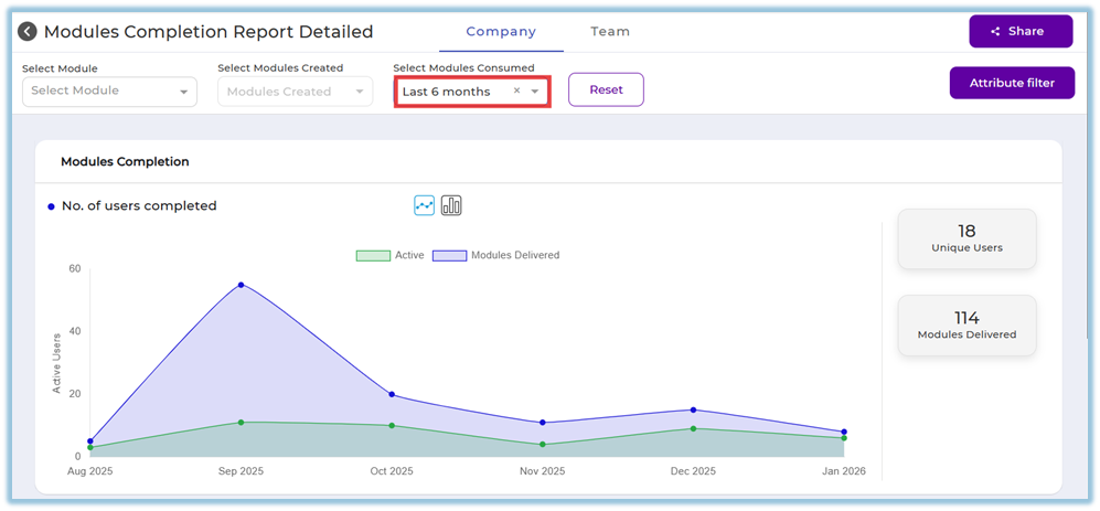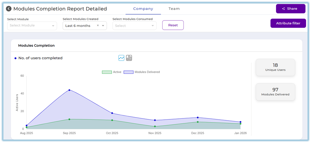 The Modules Completion Report Detailed provides a module-level and user-level view of completion activity across selected modules, allowing admins and team-level users to analyze module delivery and completion trends over a defined time period.