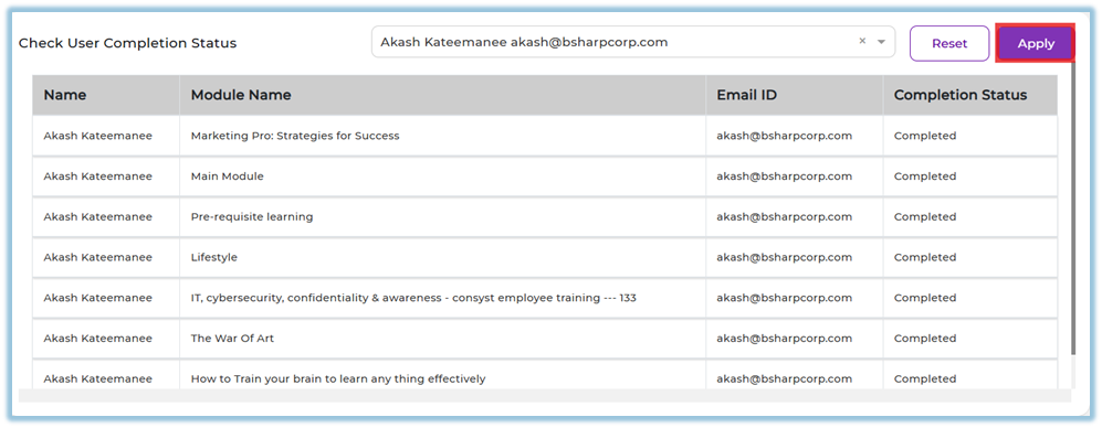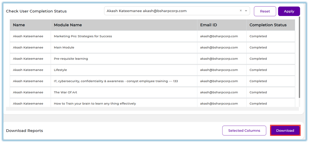 Users can view a graphical representation of modules delivered and user activity, followed by a table showing individual user completion status, including module name, email ID, and completion status. Download options are available at the bottom of the page.