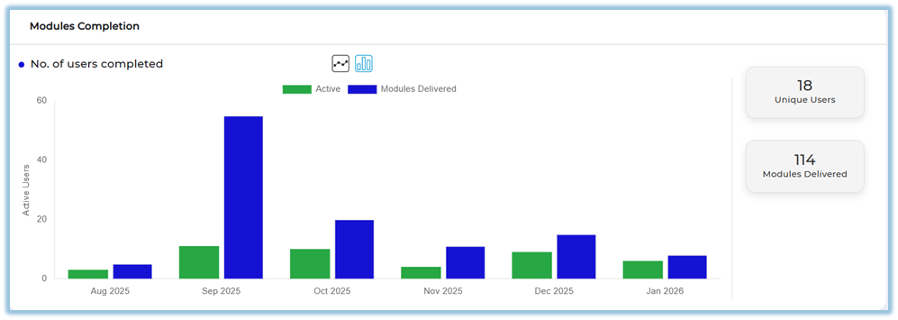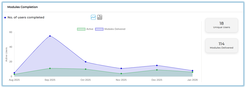 Modules completion graph – Displays module delivery and user activity trends for the selected time range.