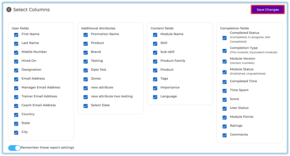 Report download and column customization – Allows selecting required data fields before downloading the report.