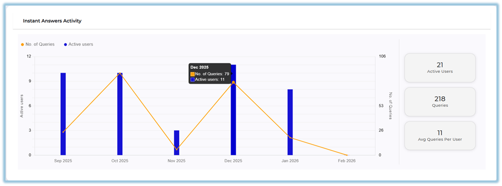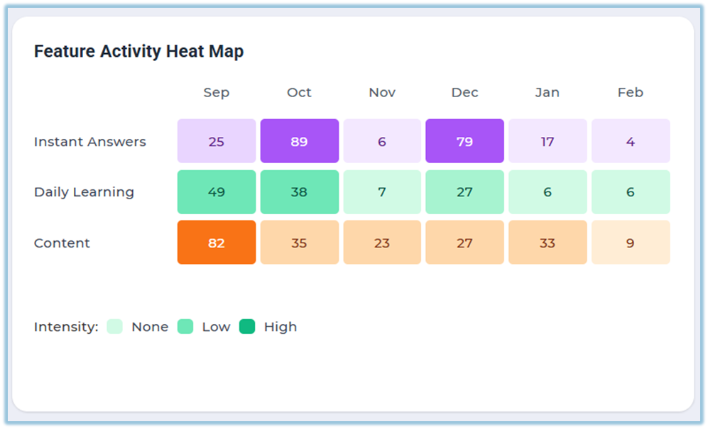 Feature Activity Heat Map – Shows feature usage intensity across Instant Answers, Daily Learning, and Content.