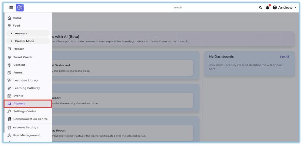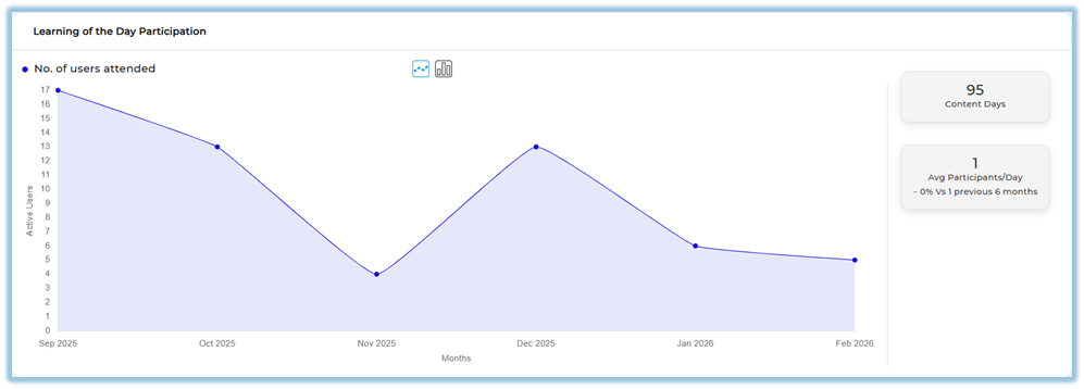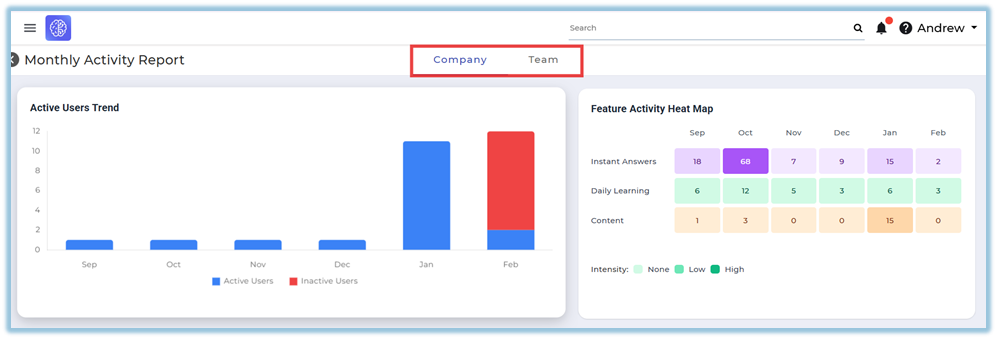 The Monthly Activity Report provides a consolidated view of user engagement across the platform. It displays activity trends, feature usage, completion metrics, inactive users, publishing trends, and leaderboards using visual dashboards and summary cards.