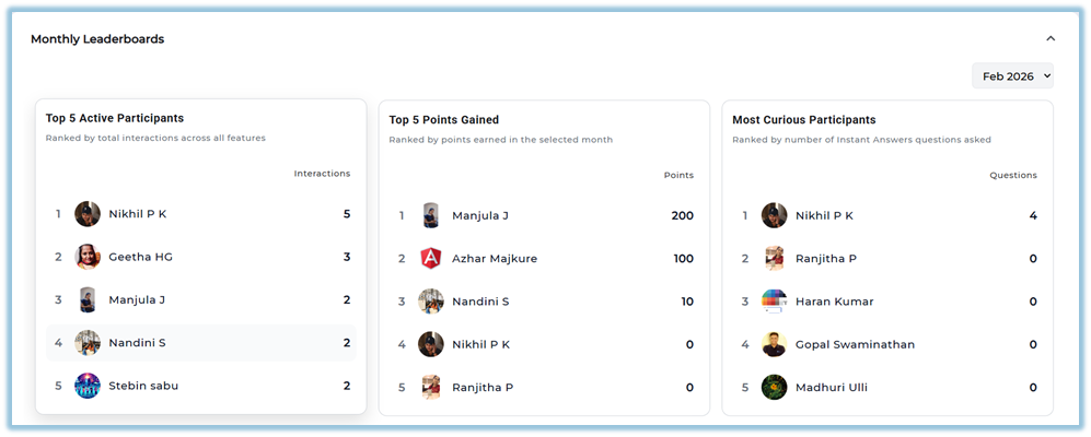 Monthly Leaderboards – Displays top participants based on interactions, points, curiosity, consistency, and content coverage.