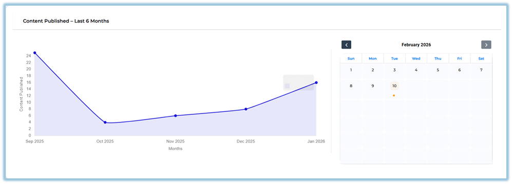 Content Published – Last 6 Months – Displays publishing trends with a calendar view.