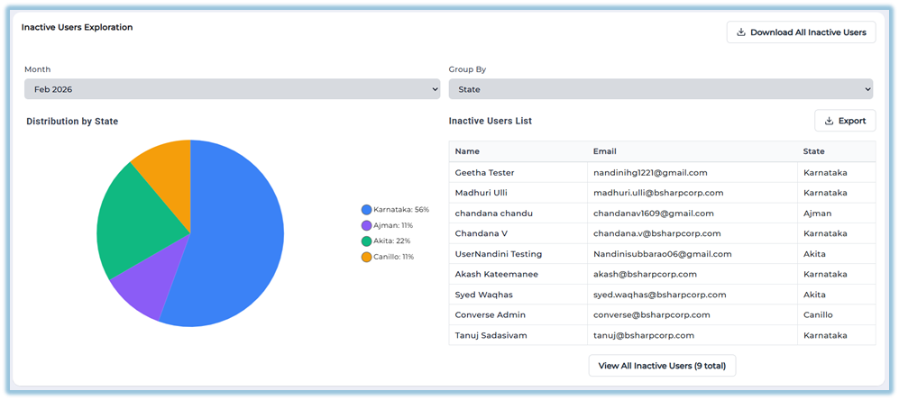 Inactive Users Exploration – Shows inactive user distribution and a detailed inactive users list.