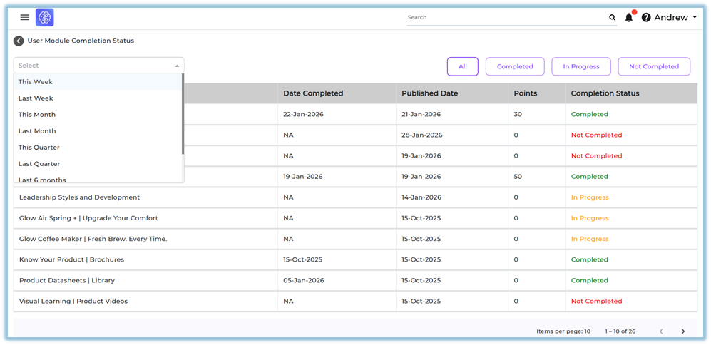 Module completion – Details of completed, in-progress, and not completed learning modules.