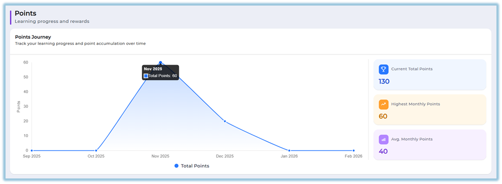 Displays current total points, highest monthly points, and average monthly points.