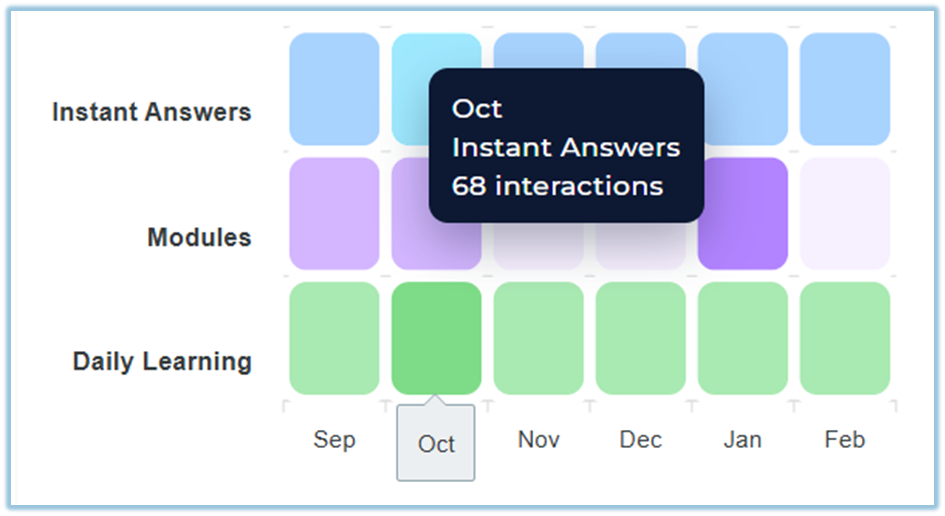 Provides an Activity by Feature section showing interactions across Instant Answers, Modules Completed, Modules, and Daily Learning.