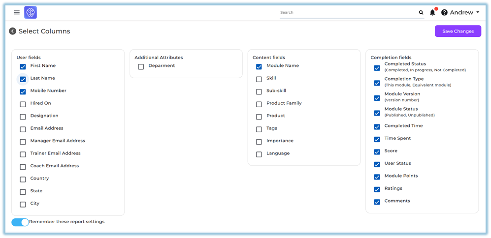 Customize report columns before downloading to avoid unnecessary data.