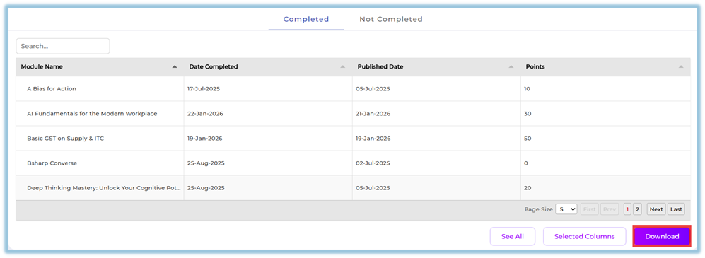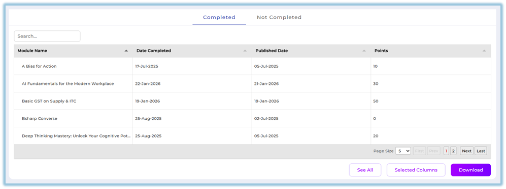 Provides a searchable table showing module name, completion date, published date, points, and completion status.
