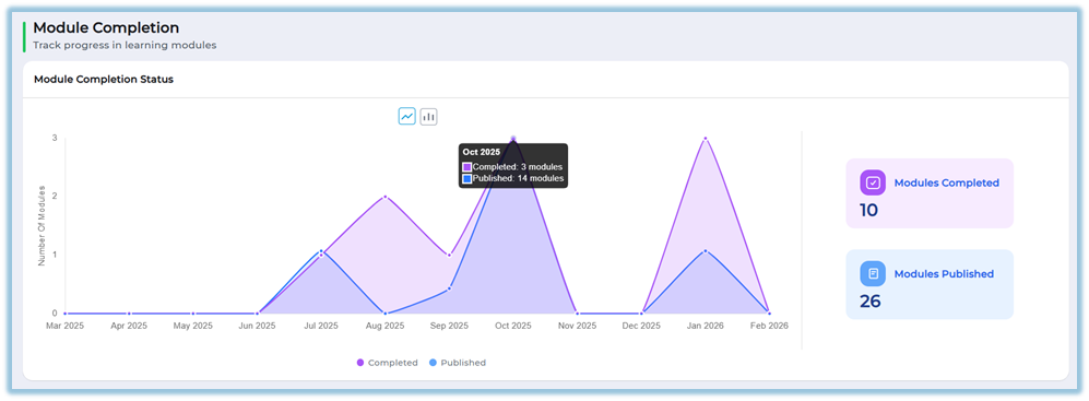 Includes a Module Completion section showing published and completed modules using bar or line graphs.