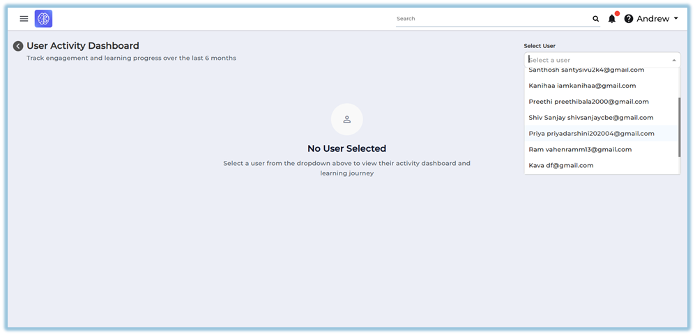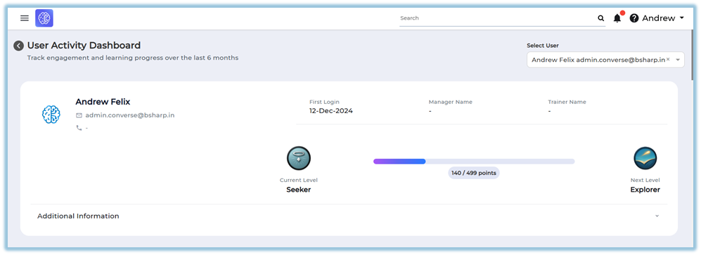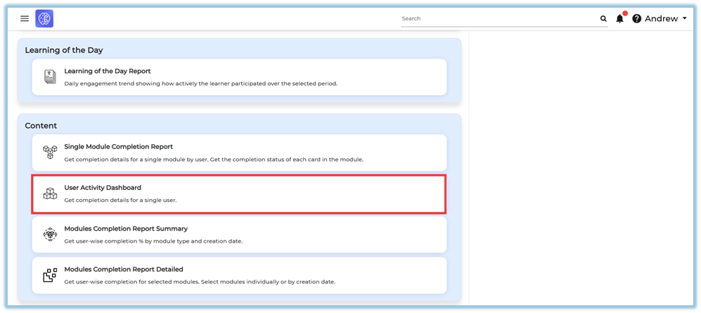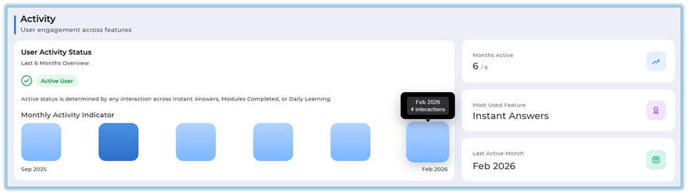 The User Activity Dashboard is a report available under the Reports section that allows administrators to view engagement and learning progress details for a single user over the last six months. It consolidates activity, learning interactions, points earned, module completion, and pathway progress into one dashboard view.