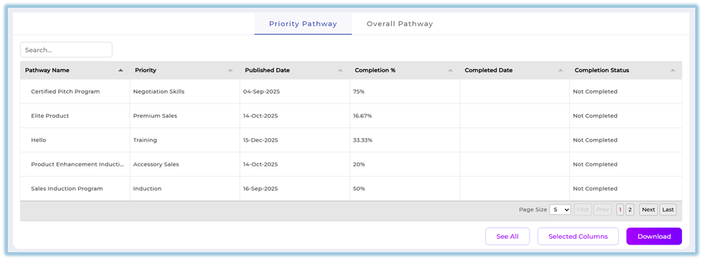 Allows viewing, filtering, customizing columns, and downloading pathway completion data.