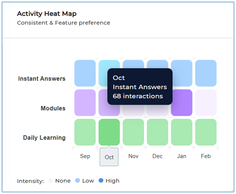 Activity heat map – A visual indicator showing consistency and feature usage intensity over time.