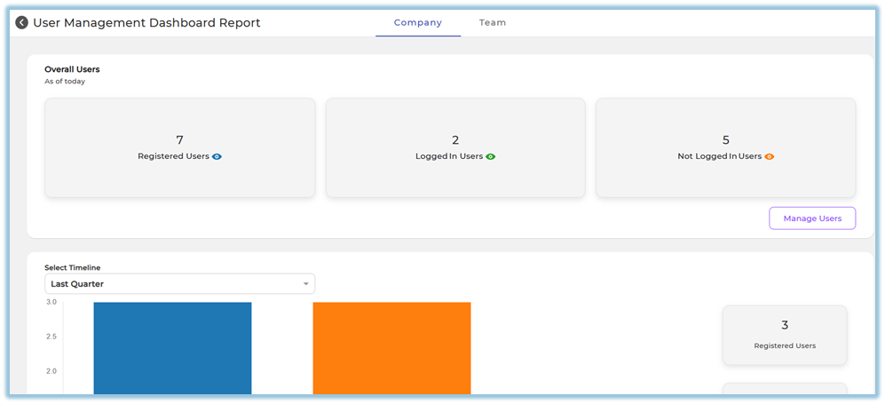 The User Management Dashboard Report helps track user onboarding and login progress across the organization. It provides visibility into registered users, login activity, and pending invitations, with separate views for admins and team owners, enabling