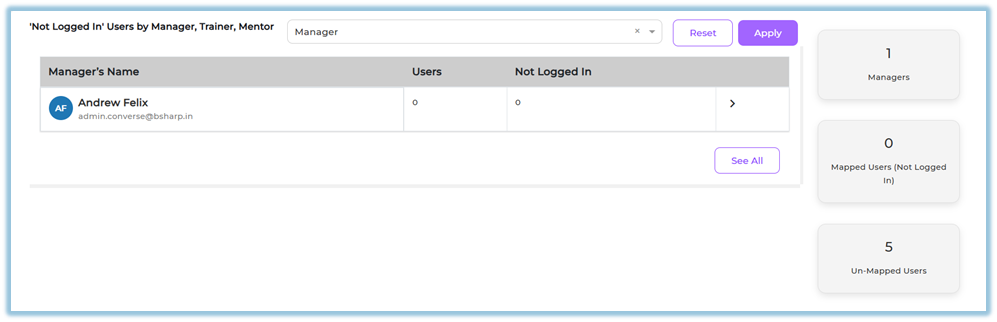 View available for Managers, Trainers, and Mentors to see only their mapped users. -