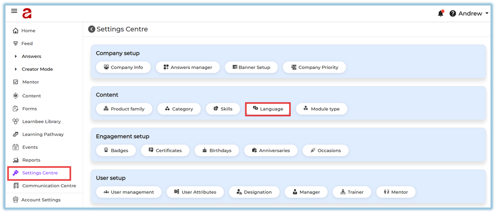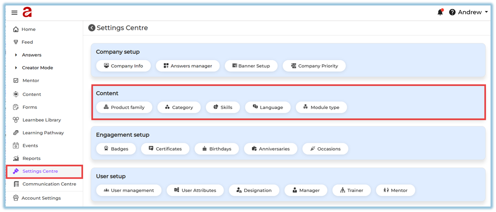 The Content section in the Settings Centre allows admins to configure all the background options required while creating learning modules. These settings define how content is categorized, organized, and displayed to users. Proper configuration here ensures a smooth and structured content creation experience.