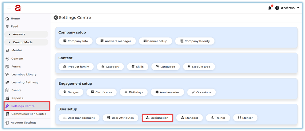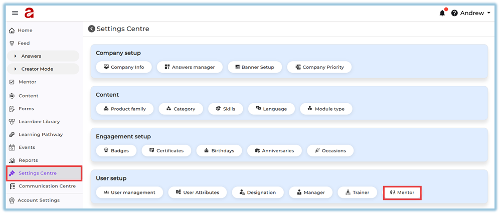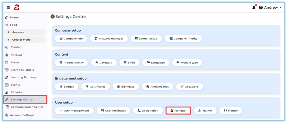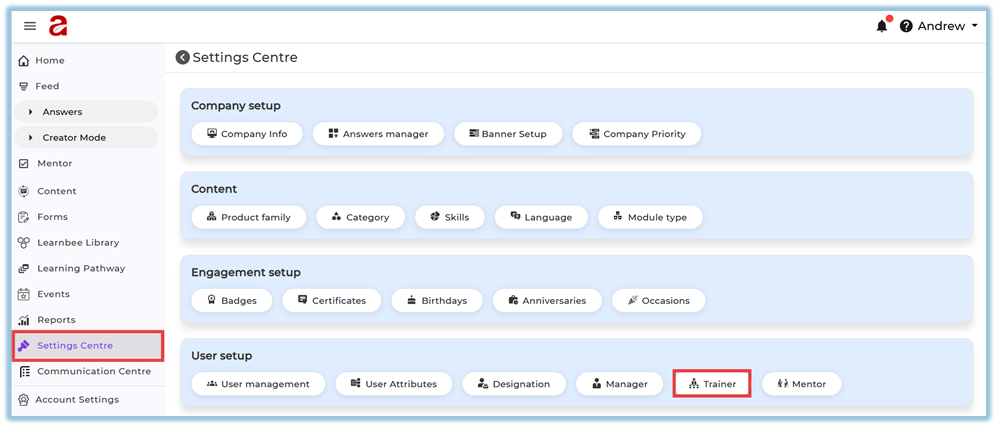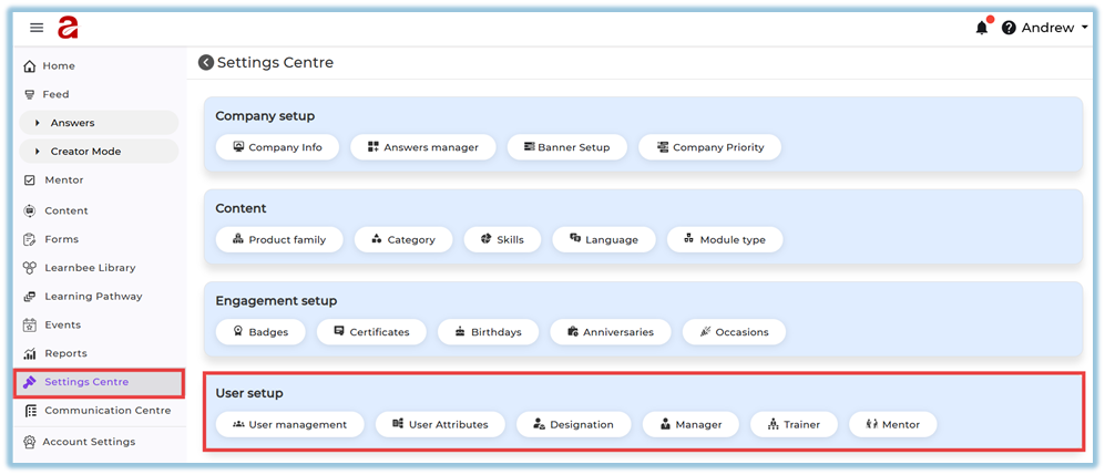 User Setup is used to add, manage, and organize users in the platform. It allows administrators to invite users, control access, assign roles, and define reporting relationships such as Manager, Trainer, and Mentor. This ensures structured user data, accurate reporting, and controlled access across the system.