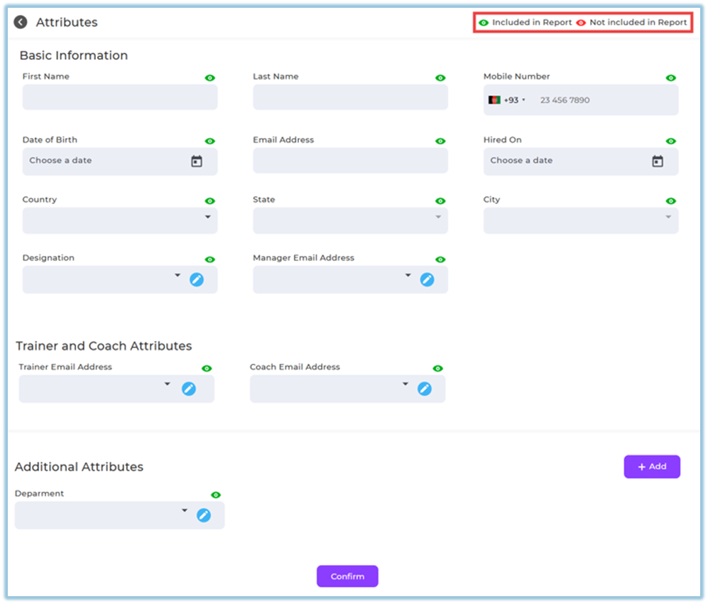 Only attributes marked with 🟢 (Included in Report) will appear in reports.